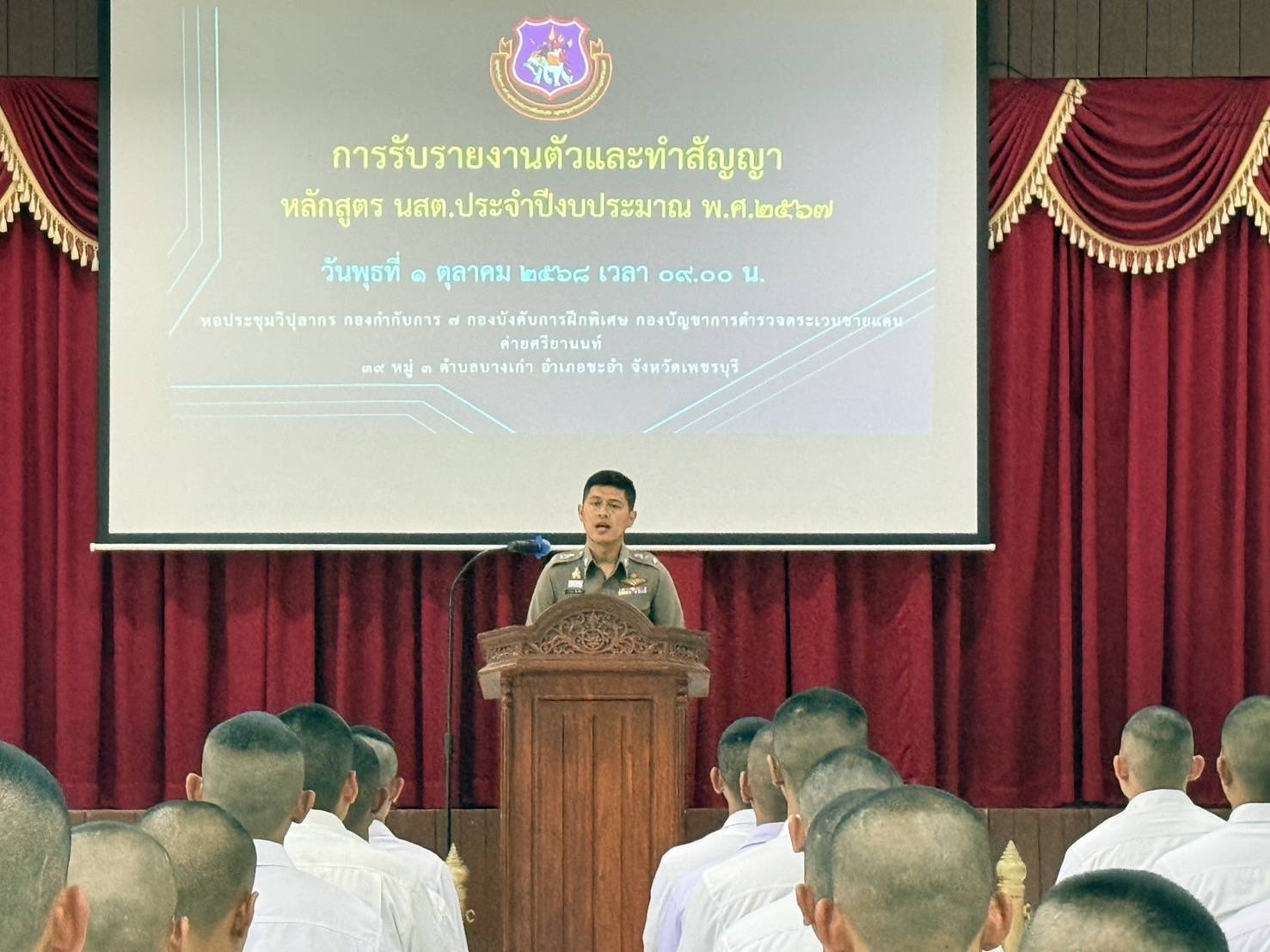 วันพุธที่ 1 ต.ค.68 เวลา 09.00 น. กก.7บก.กฝ.บช.ตชด. รับรายงานตัวและทำสัญญารับทุน สัญญาค้ำประกัน หลักสูตร นสต.ประจำปีงบประมาณ พ.ศ.2567(สังกัด บช.น.) เข้ารายงานตัวครบ 100 นาย โดยมี พ.ต.ท.ณัชพล ช้างแก้ว รอง ผกก.7 บก.กฝ.บช.ตชด. กล่าวต้อนรับ นักเรียนนายสิบตำรวจ และผู้ปกครอง