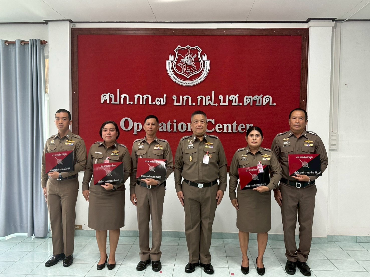 วันที่ 17 ต.ค.2568 เวลา 09.00 น. พ.ต.อ.พงศ์พัชร นิคมภักดี ผกก.7 บก.กฝ.บช.ตชด. เป็นประธานในพิธีมอบประกาศนียบัตรแก่ข้าราชการตำรวจในสังกัดที่ได้รับการคัดเลือกให้เป็นข้าราชการตำรวจที่ประพฤติปฏิบัติดีเยี่ยมตามประมวลจริยธรรมและจรรยาบรรณของตำรวจ สมควรได้รับการยกย่องเชิดชูเกียรติเพื่อเป็นแบบอย่างที่ดี ประจำปี พ.ศ.2568 ของสำนักงานตำรวจแห่งชาติ มีผู้ได้รับใบประกาศนียบัตรฯ จำนวน 5 ราย ได้แก่ พ.ต.ท.ชัยชา วังคีรี รอง ผกก.7 บก.กฝ.บช.ตชด., พ.ต.ท.อภิชาติ เปรี้ยวน้อย สว.กก.7 บก.กฝ.บช.ตชด., พ.ต.ท.หญิง ทรรศกมล จันทร์เทียม สว.กก.7 บก.กฝ.บช.ตชด., พ.ต.ท.หญิง ชนากานต์ เพ็ชรตีบ สว.กก.7 บก.กฝ.บช.ตชด., ร.ต.ท.ธีรพงษ์ เกตุสิงห์น้อย ผบ.มว.กก.7 บก.กฝ.บช.ตชด. และ ร.ต.ท.ริน อิ่มคล้าย รอง สว.(ป.) กก.7 บก.กฝ.บช.ตชด. ณ ห้องประชุมเพิ่มวงศ์